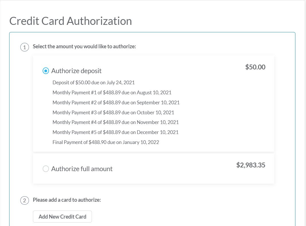 You can enroll in our automatic billing, and relax knowing that your future payments will be made automatically. When you book, we’ll calculate an evenly divided automatic billing plan for you and you will know in advance the day of every month that your payment will be processed. Your initial deposit is due at the time of booking, and your future payments will be charged according to the schedule you see on your invoice. Automatic billing is available at no charge.